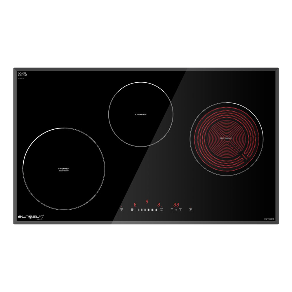 - SCHOTT CERAN: Bếp điện từ ba EUROSUN EU-TE882G sử dụng mặt kính thương hiệu Schott Ceran made in Germany cao cấp nhất trên thị trường bếp hiện tại. Mặt kính đi đầu với các đặc tính: chống trầy xước, hạn chế nứt vỡ, chống sock nhiệt lên tới 1000 độ, thân thiện với môi trường, bền bỉ hàng chục năm…