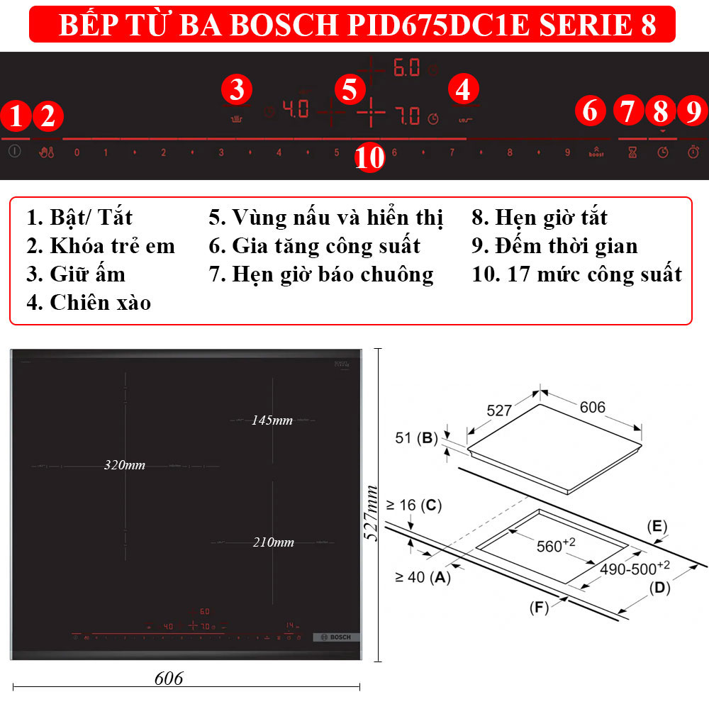 Thông số kĩ thuật Bếp từ ba BOSCH PID675DC1E serie 8