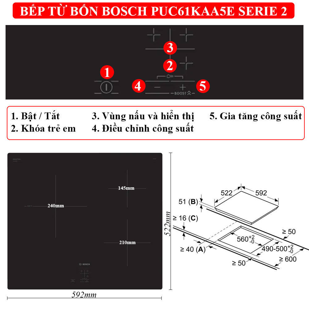 Thông số kĩ thuật Bếp từ ba BOSCH PUC61KAA5E serie 2