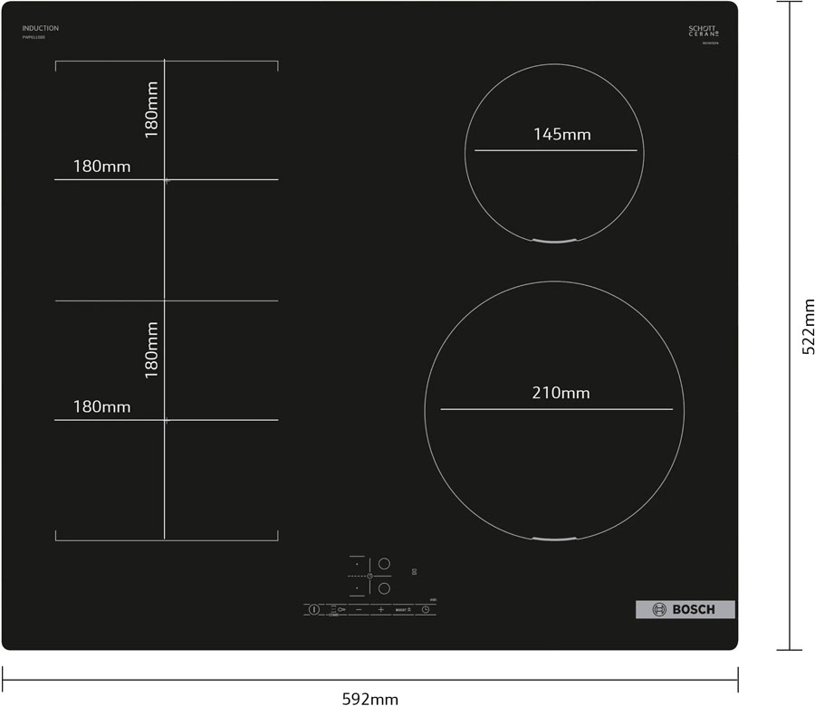 | Kích thước vùng nấu | Ø180 mm, Ø180 mm, Ø210 mm, Ø145 mm |