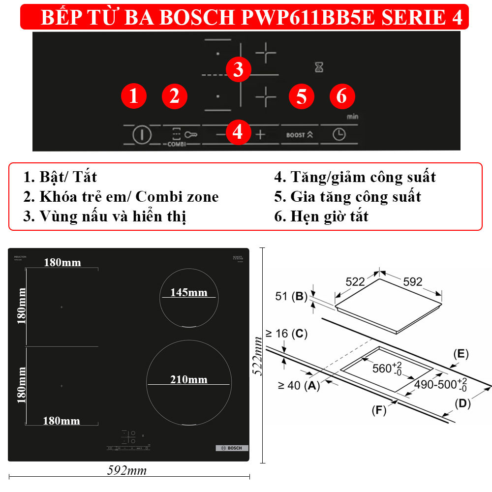- Vùng sau trái Ø180 mm: 1.8 kW (tối đa 3.0 kW với PowerBoost).