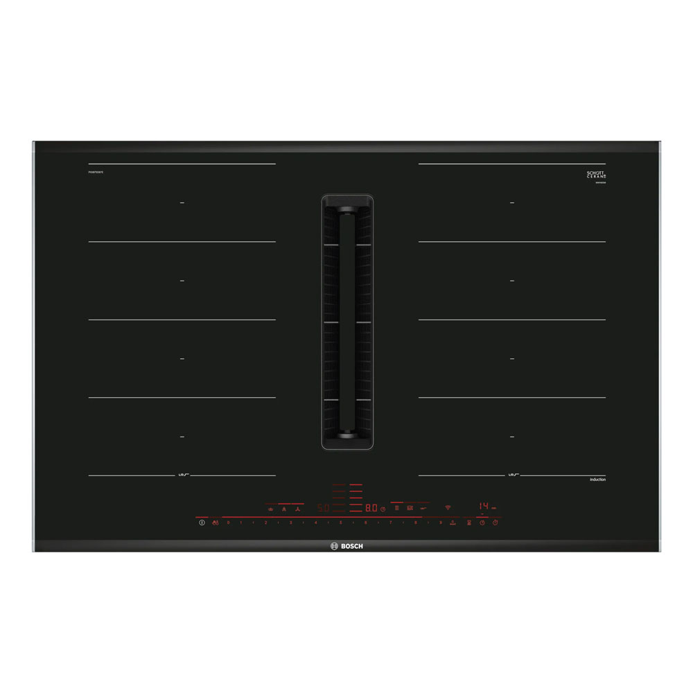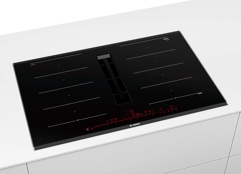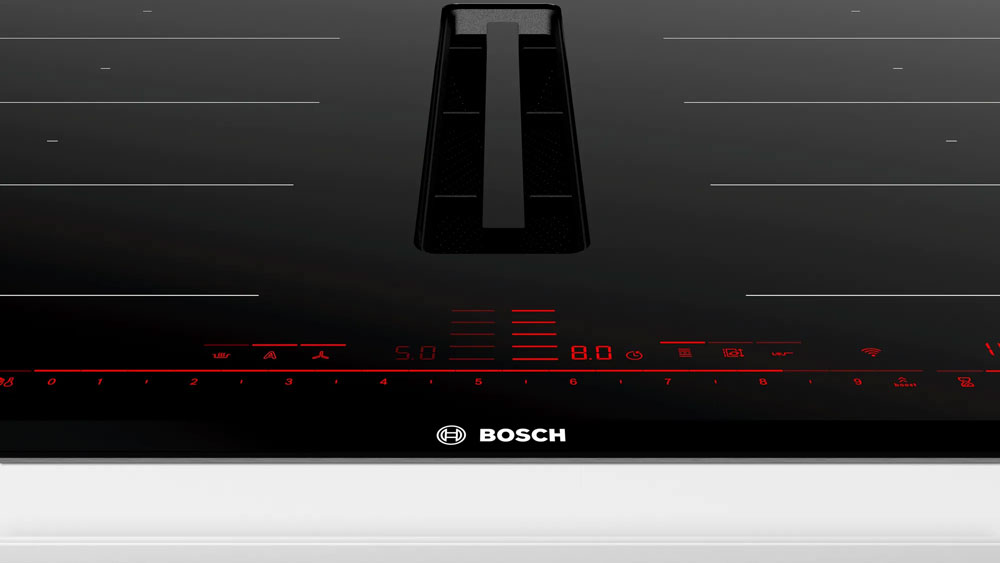 Bếp từ bốn kết hợp hút mùi BOSCH PXX875D67E serie 8 toàn vùng nấu.
