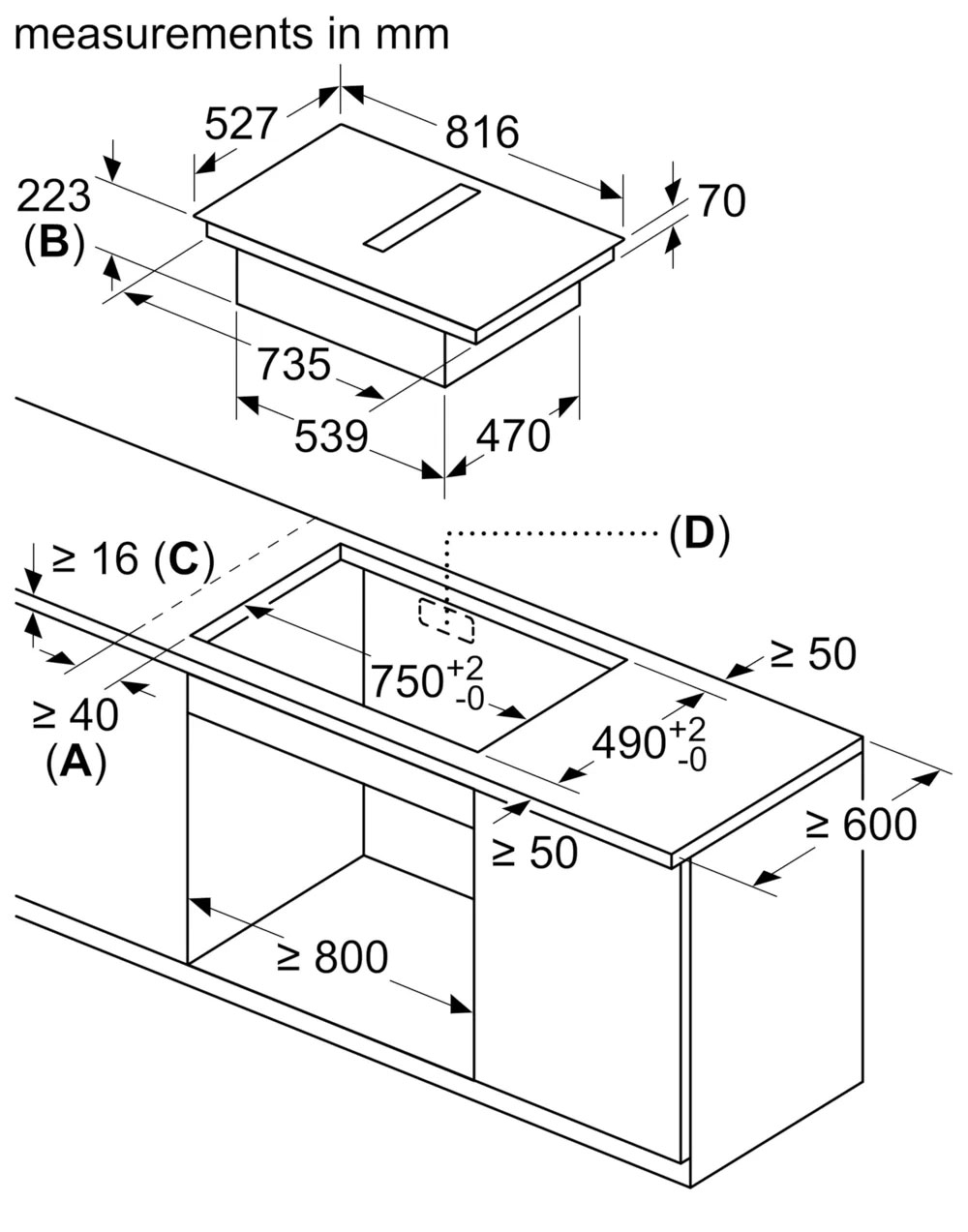 Bản vẽ kích thước Bếp từ bốn kết hợp hút mùi BOSCH HMH.PXX875D67E toàn vùng nấu serie 8