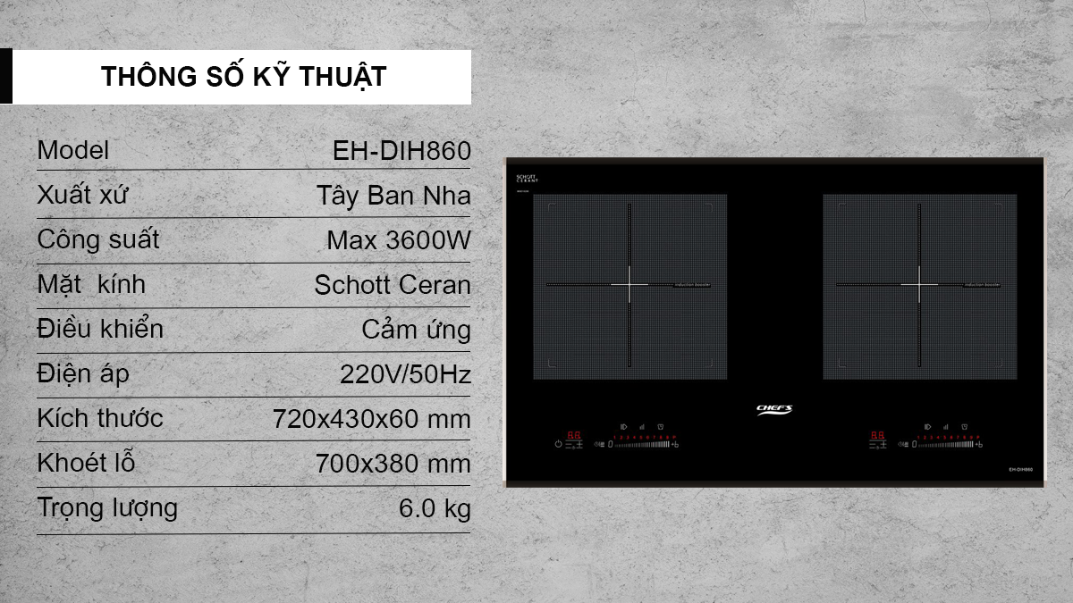 Thông số kĩ thuật Bếp từ đôi CHEFS EH-DIH860