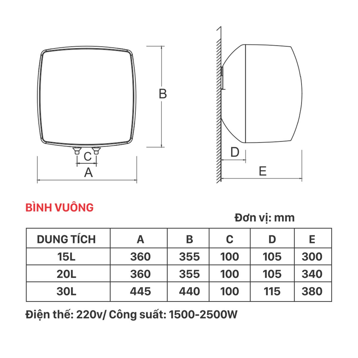 ban ve kich thuoc Binh nong lanh PICENZA V15EW 15L vuong