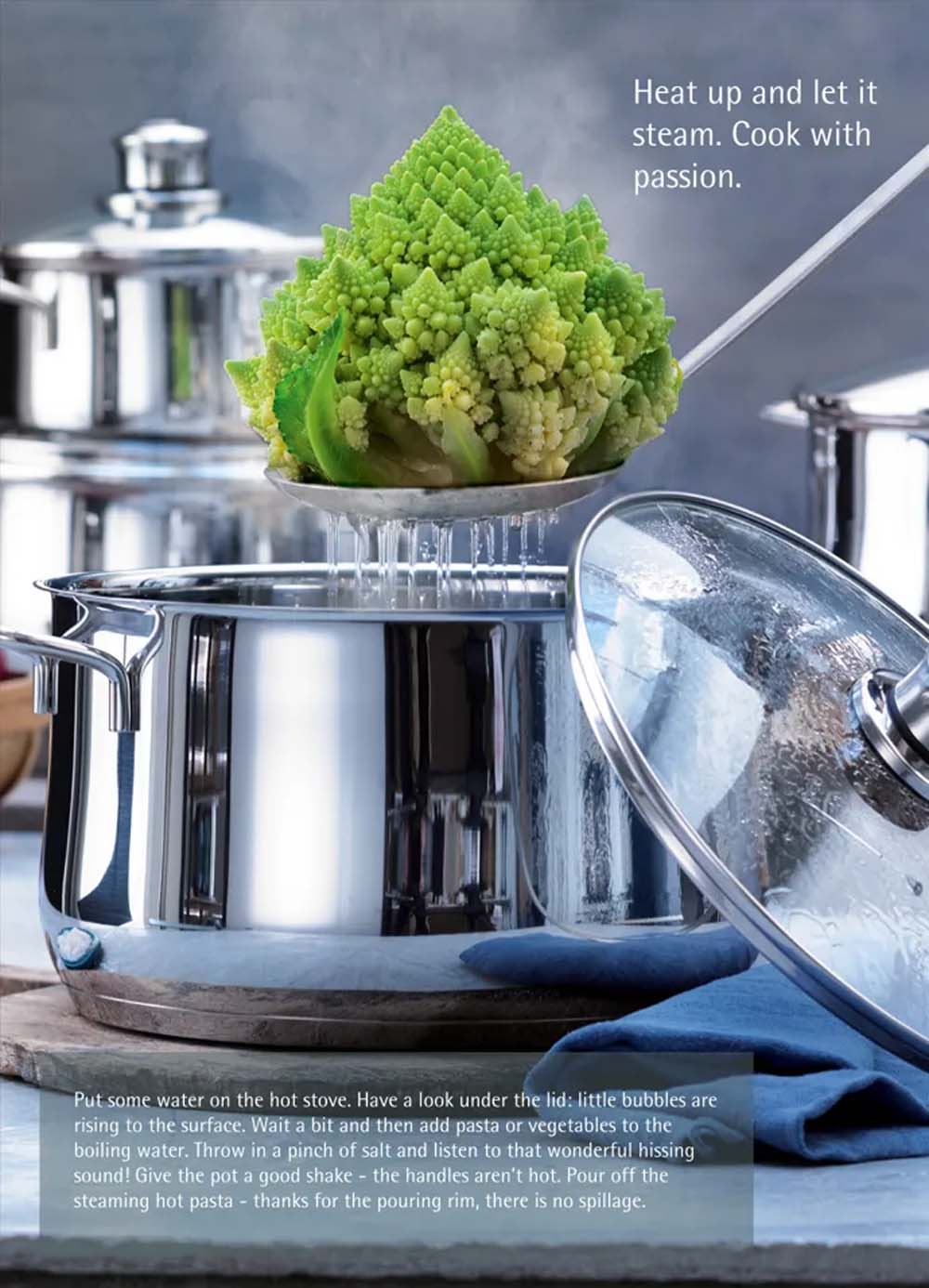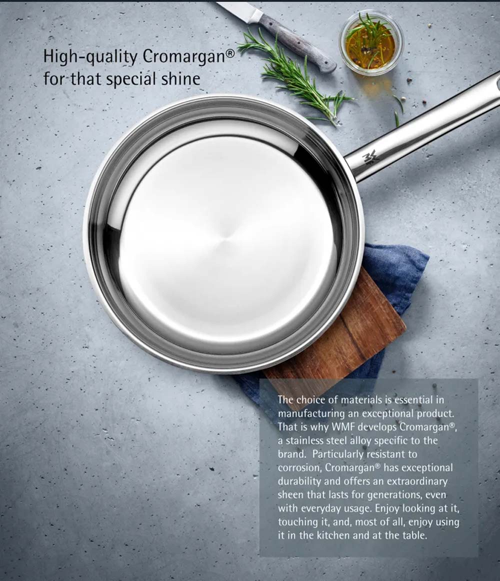 - Chất Liệu Thép Cromargan 18/10: Bộ nồi được làm từ thép Cromargan 18/10 đúc nguyên khối, mang lại sự sang trọng, bền bỉ và sáng bóng cho sản phẩm.