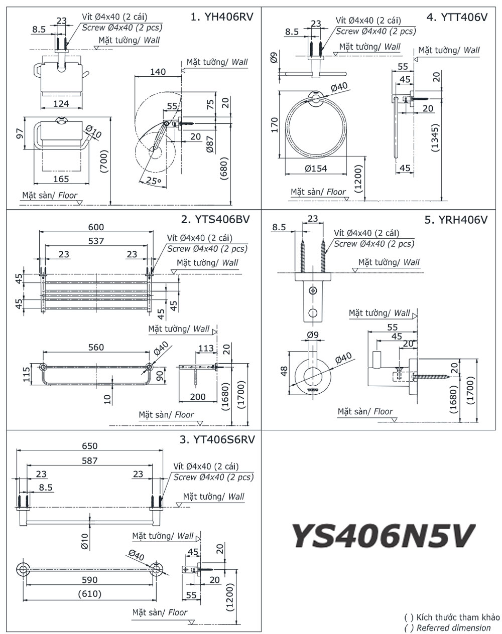 Bản vẽ kĩ thuật Bộ phụ kiện phòng tắm TOTO YS406N5V 5 Món