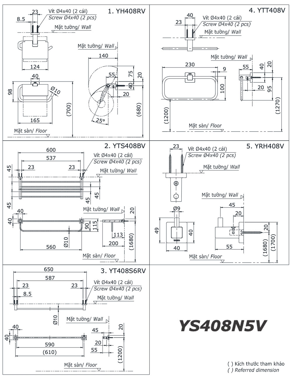 Bản vẽ kĩ thuật Bộ phụ kiện phòng tắm TOTO YS408N5V 5 Món