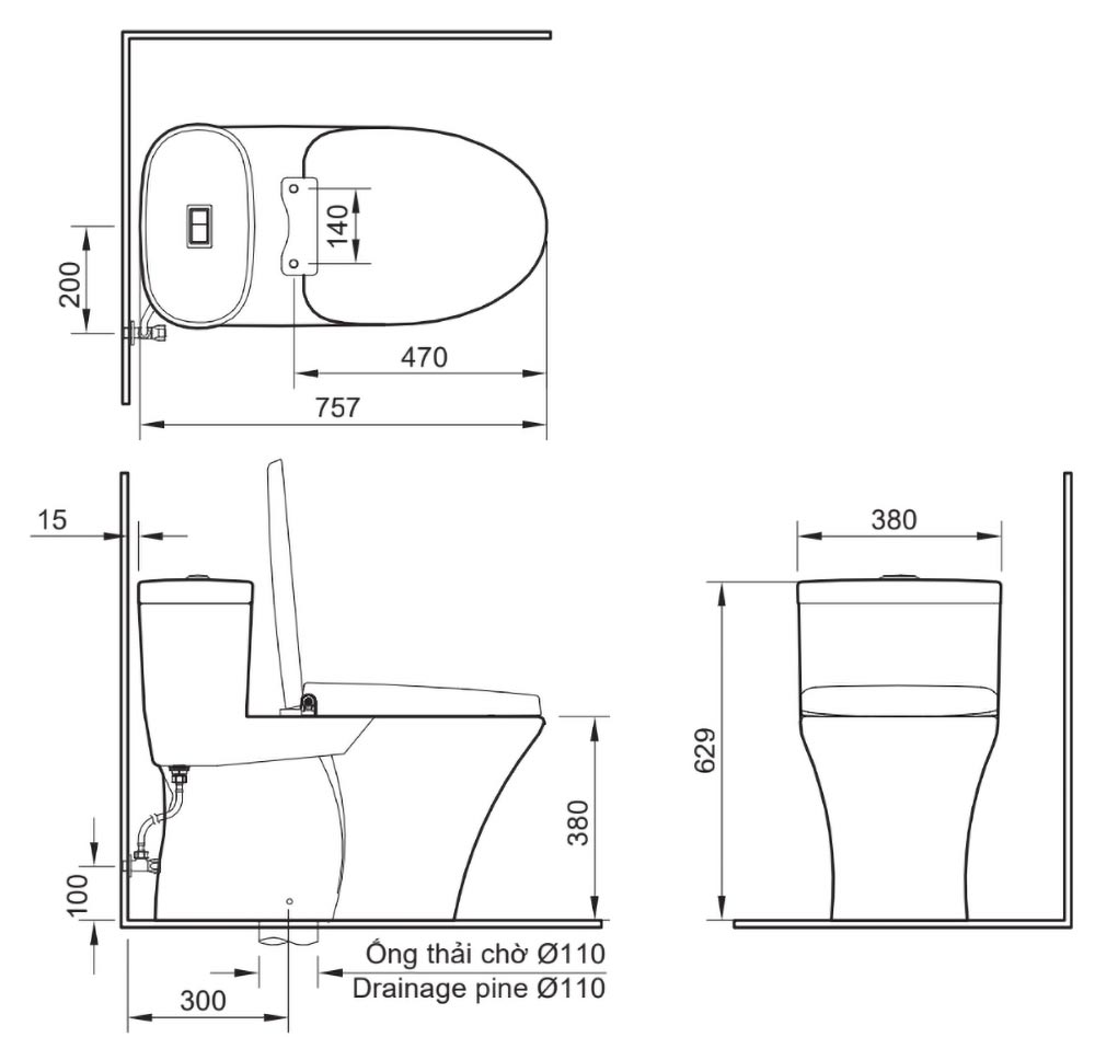 - Đường kính ống thải chờ : phi 110