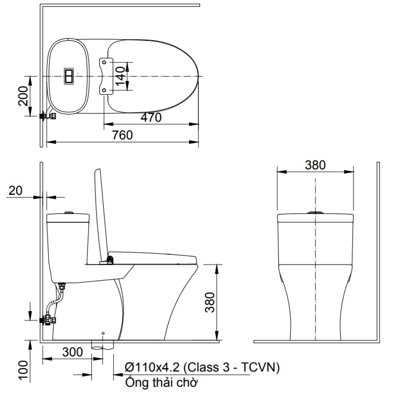 | Kích thước bồn cầu | 760 x 380 x 636 (dài x rộng x cao) |