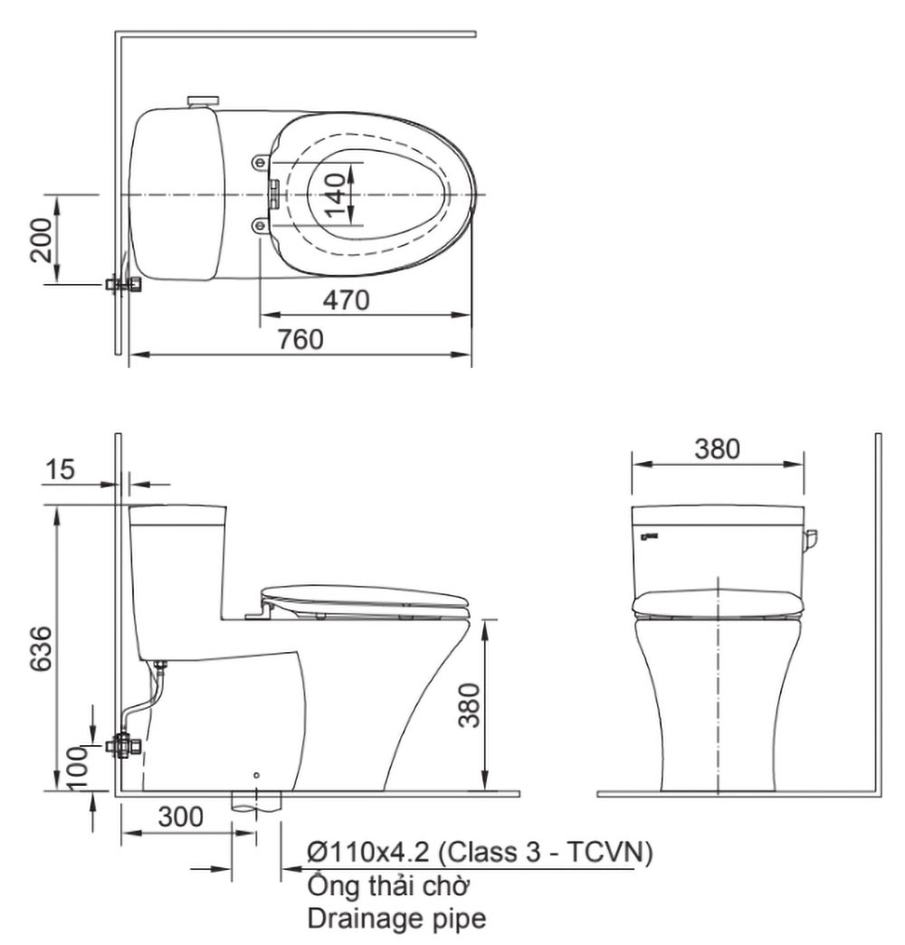 | Kích thước bồn cầu | 757x380x636 (dài x rộng x cao) |