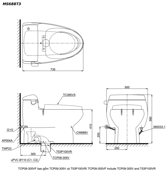 Bản vẽ kĩ thuật Bồn cầu 1 khối TOTO MS688T3 nắp êm TC385VS