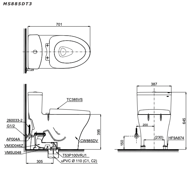 Thông số kĩ thuật bồn cầu 1 khối TOTO MS885DT3 nắp êm TC385VS