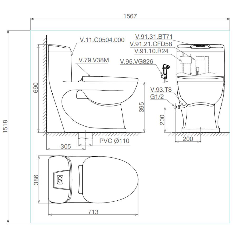 Bản vẽ kĩ thuật Bồn cầu 1 khối VIGLACERA C0504 nắp êm