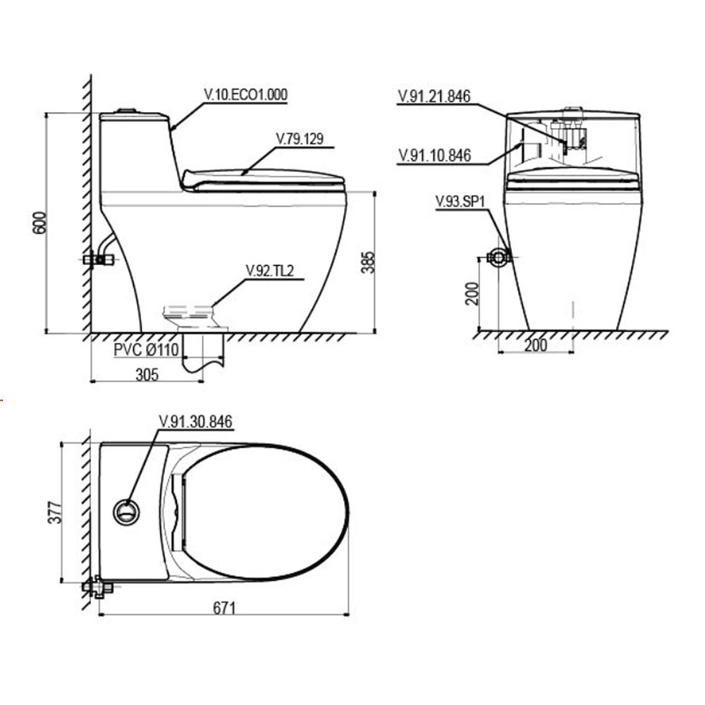 Bản vẽ kĩ thuật Bồn cầu 1 khối VIGLACERA ECO 1 nắp êm