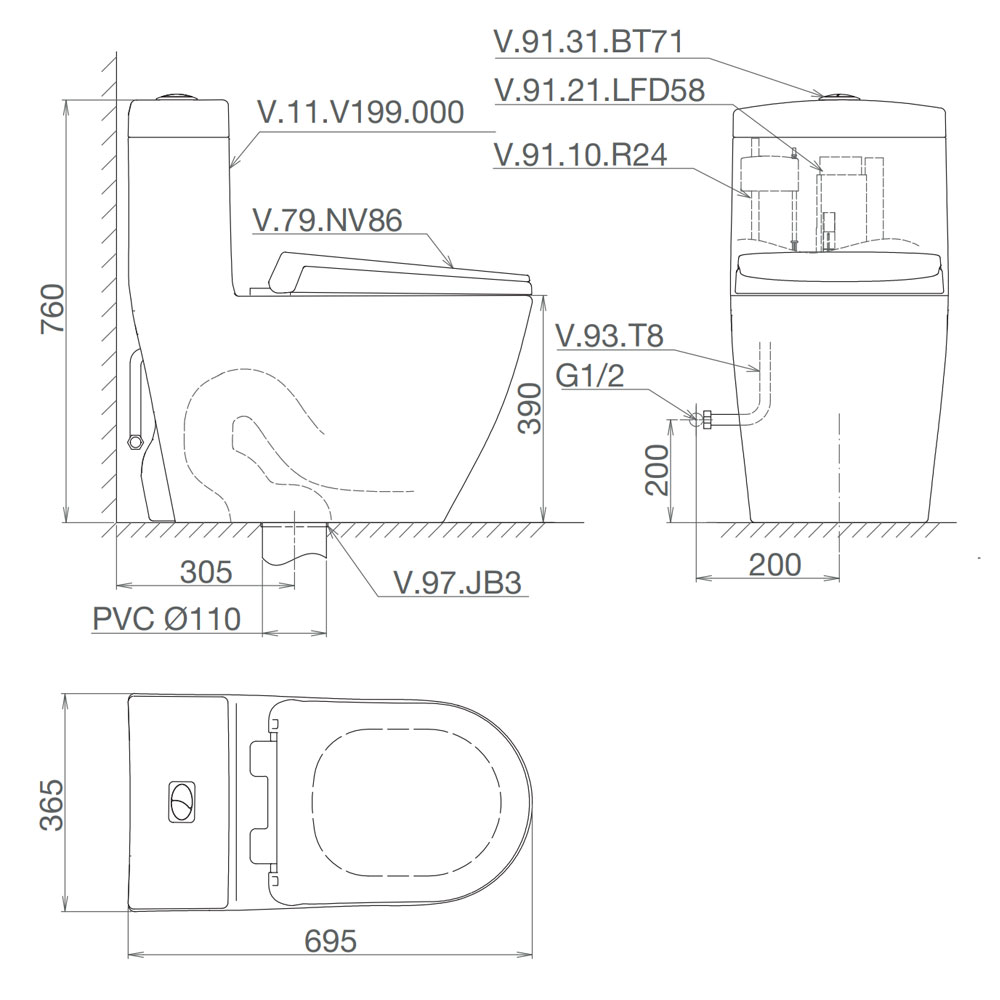 Bản vẽ kĩ thuật Bồn cầu 1 khối VIGLACERA V199 nắp êm