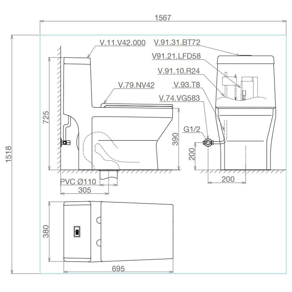 Bản vẽ kĩ thuật Bồn cầu 1 khối VIGLACERA V42 nắp êm