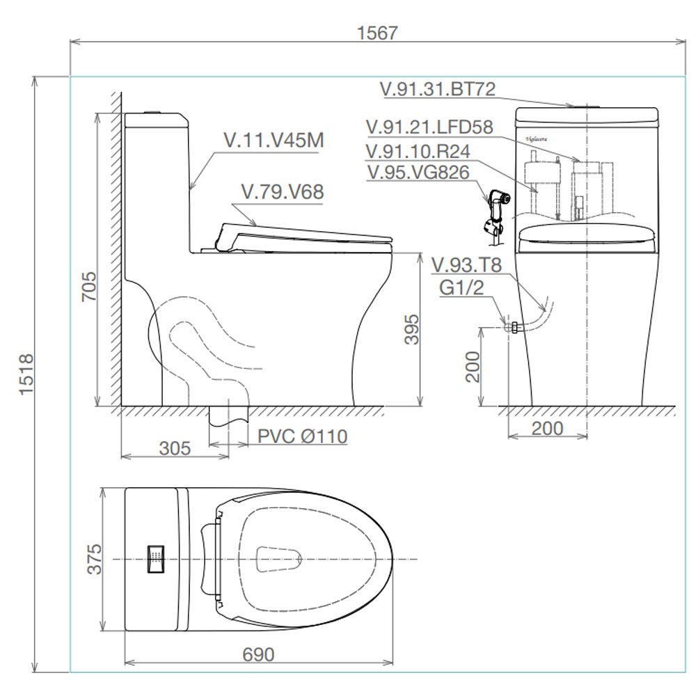 Bản vẽ kĩ thuật Bồn cầu 1 khối VIGLACERA V45 V45M nắp êm
