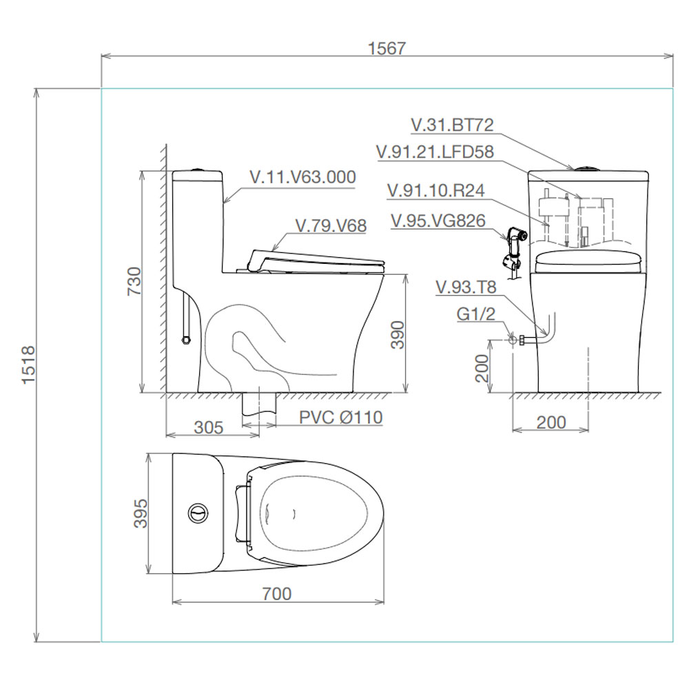 Bản vẽ kĩ thuật Bồn cầu 1 khối VIGLACERA V63 nắp êm