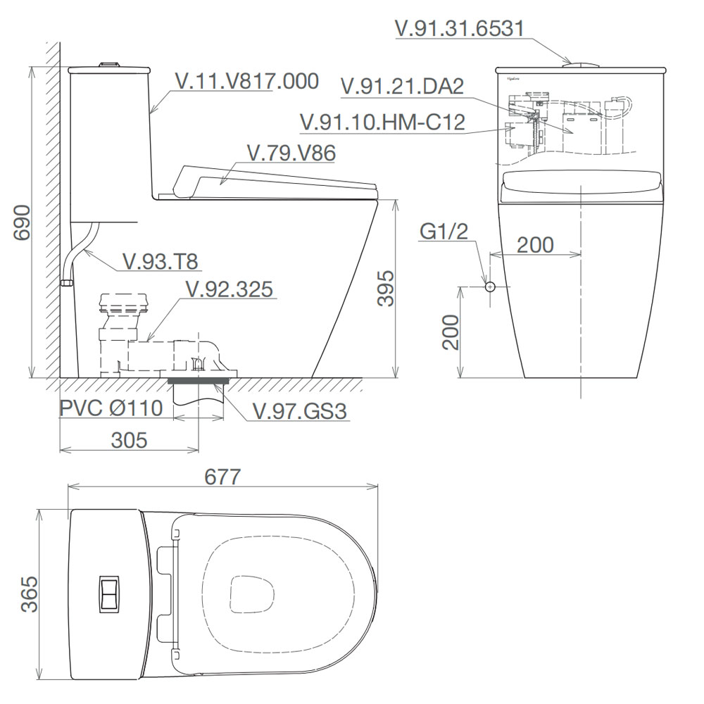 Bản vẽ kĩ thuật Bồn cầu 1 khối VIGLACERA V817 nắp êm V867