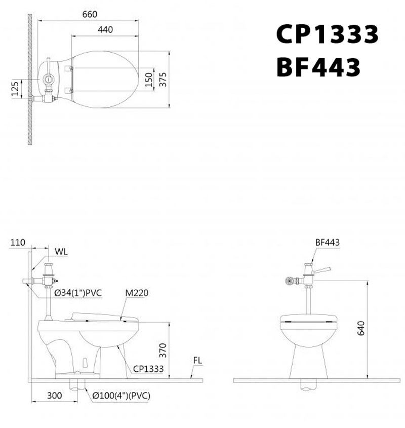 Bản vẽ kĩ thuật Bồn cầu 2 khối CAESAR CP1333 BF443 xả gạt tay nắp thường M220