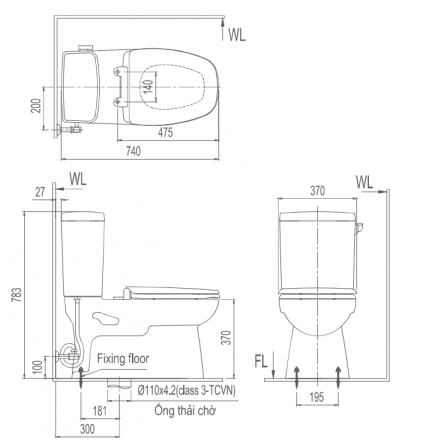 | Kích thước bồn cầu | 740x370x783 (dài x rộng x cao) |