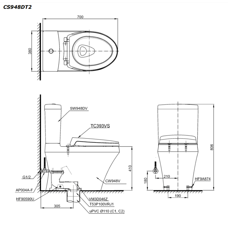 Thông số kĩ thuật bồn cầu 2 khối TOTO CS948DT2 nắp êm TC393VS