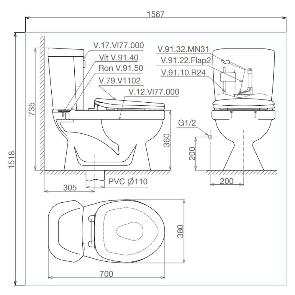 Bản-vẽ-kĩ-thuật-Bồn-cầu-2-khối-VIGLACERA-VI77-nắp-êm-V116