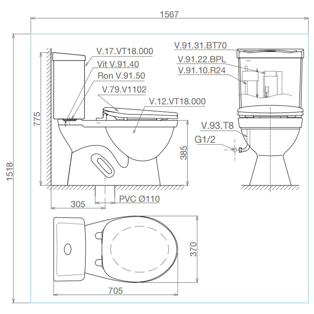 Bản vẽ kĩ thuật Bồn cầu 2 khối VIGLACERA VT18M nắp êm V116