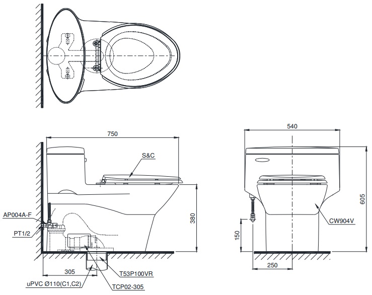 Bản vẽ kĩ thuật Bồn cầu 1 khối TOTO MS904T2 nắp êm TC393VS