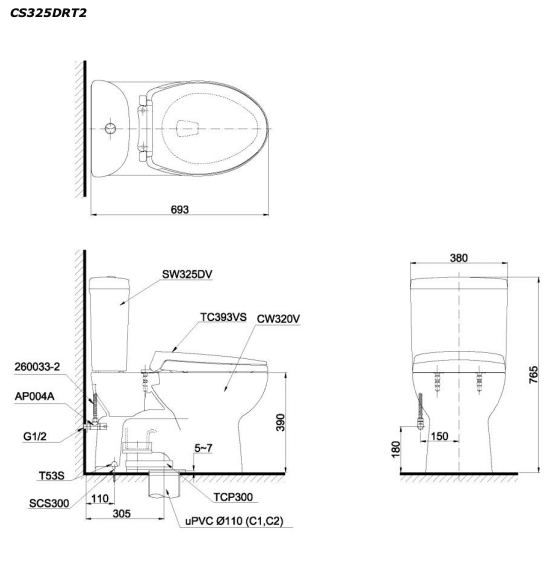 Bản vẽ kĩ thuật Bồn cầu thông minh TOTO CS325DRW7#W nắp rửa điện tử TCF6631A