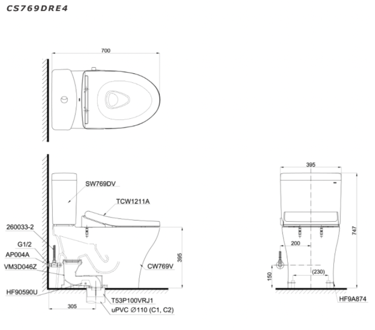 Bản vẽ kĩ thuật Bồn cầu 2 khối TOTO CS769DRE4 nắp rửa cơ TCW1211A