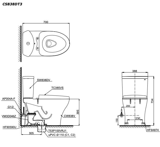 Bản vẽ kỹ thuật Bồn cầu 2 khối TOTO CS838D