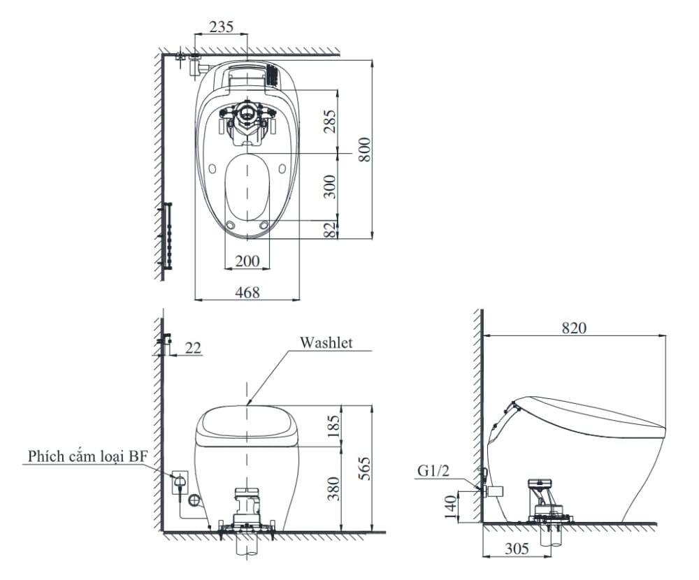- Kích thước bệt (sâu x rộng x cao) : 800x468x565mm