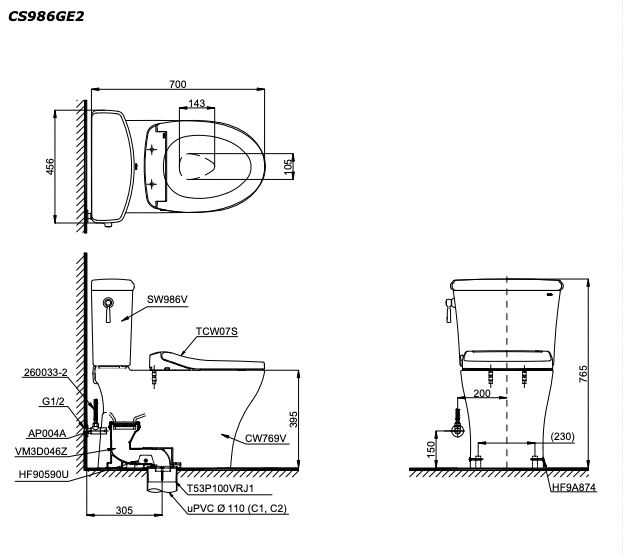 Bản vẽ kĩ thuật Bồn cầu 2 khối TOTO CS986GE2 nắp rửa cơ TCW07S