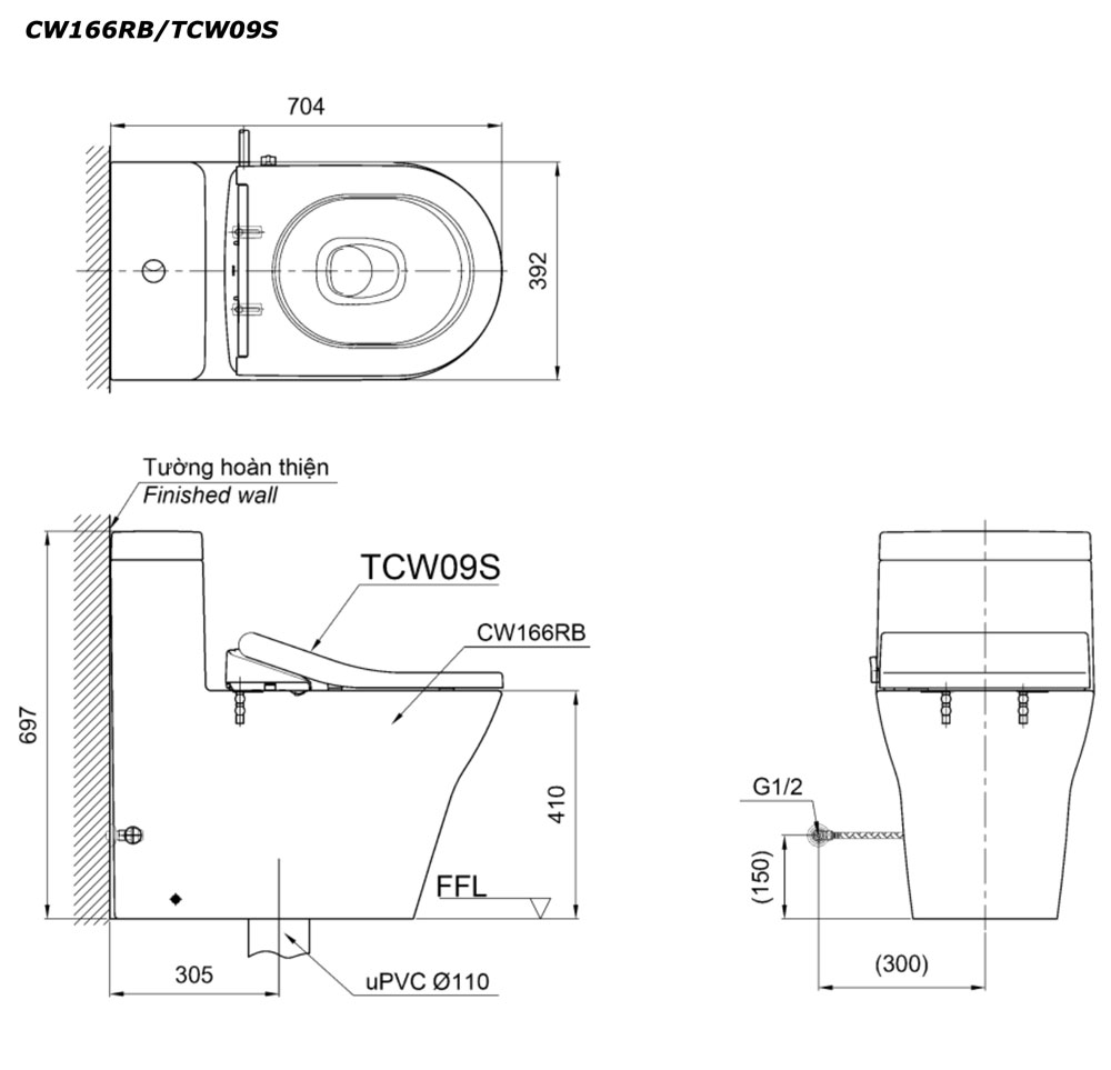- Bao gồm: thân bệt 1 khối ( đi kèm bộ xả ) , nắp két nước, bộ nắp rửa cơ TCW09S (E5), bích nối sàn ( con thỏ ), van khoá nước, cút nối, dây cấp nước, ống nối sàn, bộ cố định