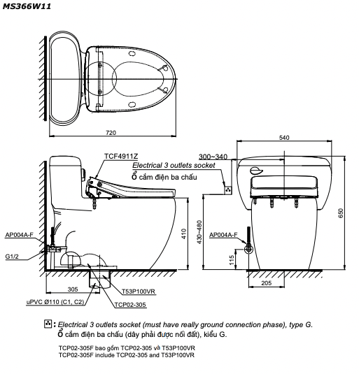 Bản vẽ kĩ thuật Bồn cầu thông minh TOTO MS366W11 nắp rửa điện tử TCF4911Z