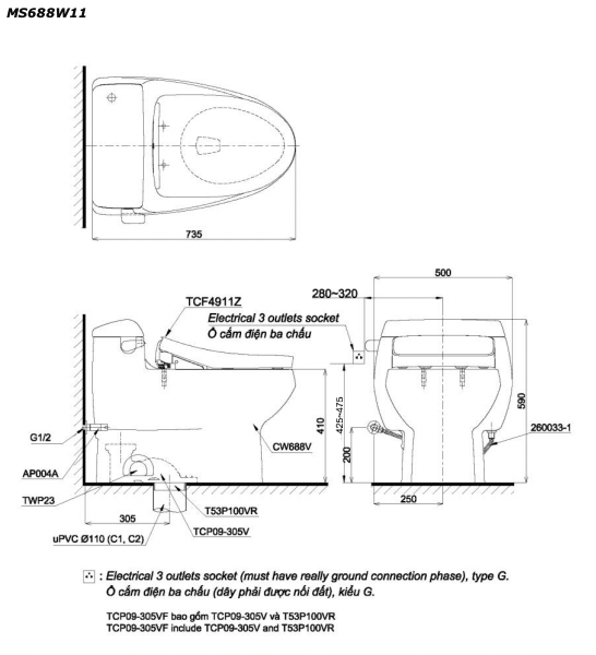 Thông số kĩ thuật Bồn cầu thông minh TOTO MS688W11 nắp rửa thông minh TCF4911Z