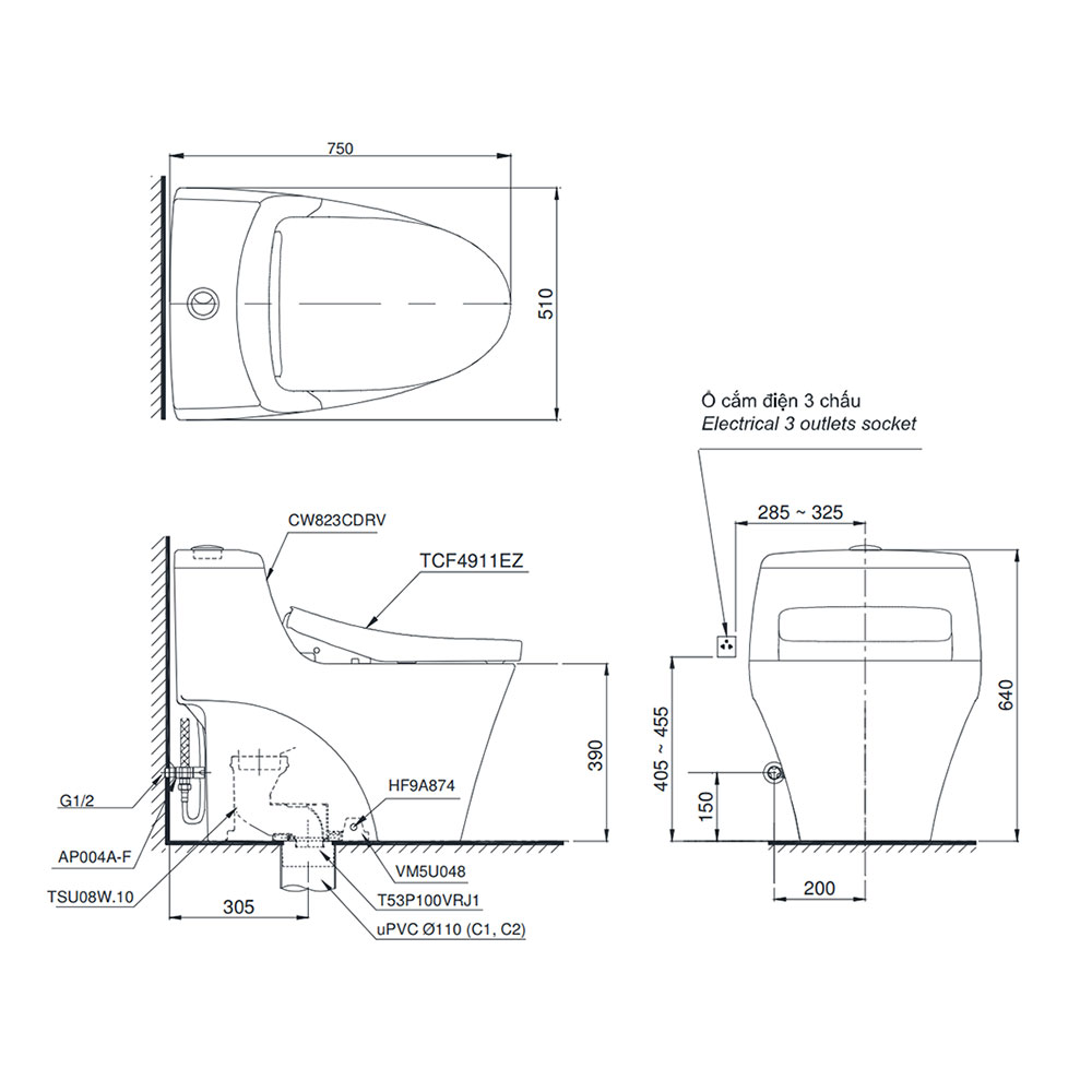Bản vẽ kĩ thuật Bồn cầu thông minh TOTO MS823CDRW23 nắp rửa điện tử TCF47360GAA