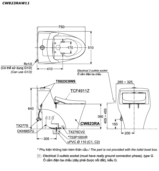 Bản vẽ kĩ thuật Bồn cầu 1 khối TOTO CW823RAW11 nắp rửa điện tử TCF4911Z