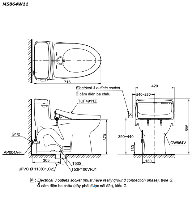 Thông số kĩ thuật bồn cầu thông minh TOTO MS864W11 nắp rửa thông minh TCF4911Z