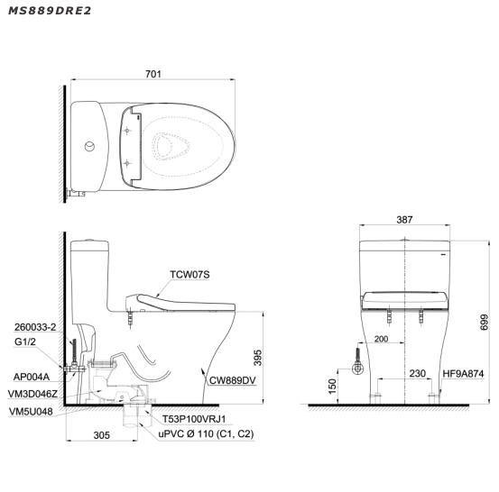 Thông số kĩ thuật bồn cầu thông minh TOTO MS889DRE2 nắp rửa cơ TCW07S