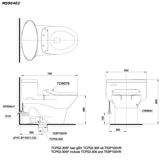 Bản vẽ kĩ thuật Bồn cầu 1 khối TOTO MS904E2 nắp rửa cơ TCW07S