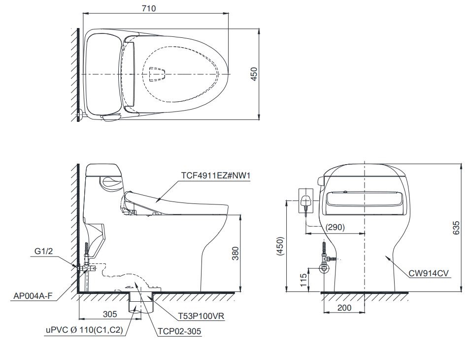 Bản vẽ kĩ thuật Bồn cầu thông minh TOTO MS914CRW12 nắp rửa thông minh TCF4911EZ