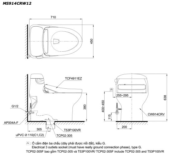 Thông số kĩ thuật bồn cầu thông minh TOTO MS914CRW12 nắp rửa thông minh TCF4911EZ