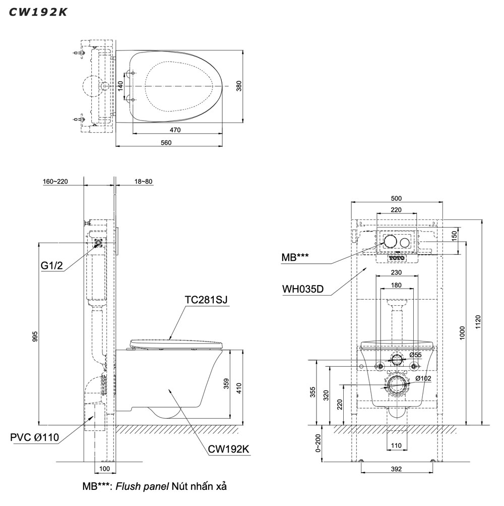 Bản vẽ kĩ thuật Bồn cầu treo tường TOTO CW192K TC281SJ nắp êm