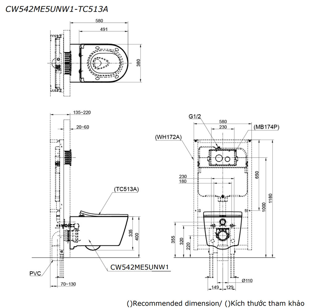 Bản vẽ kĩ thuật Bồn cầu treo tường TOTO CW542ME5UNW1 TC513A nắp êm