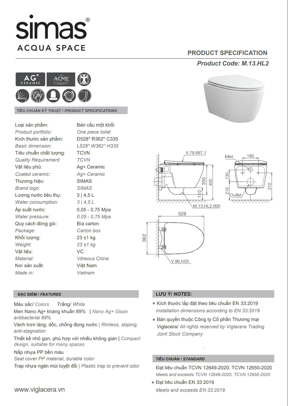 Thông số kĩ thuật Bồn cầu treo tường VIGLACERA V.13.HL2 nắp êm