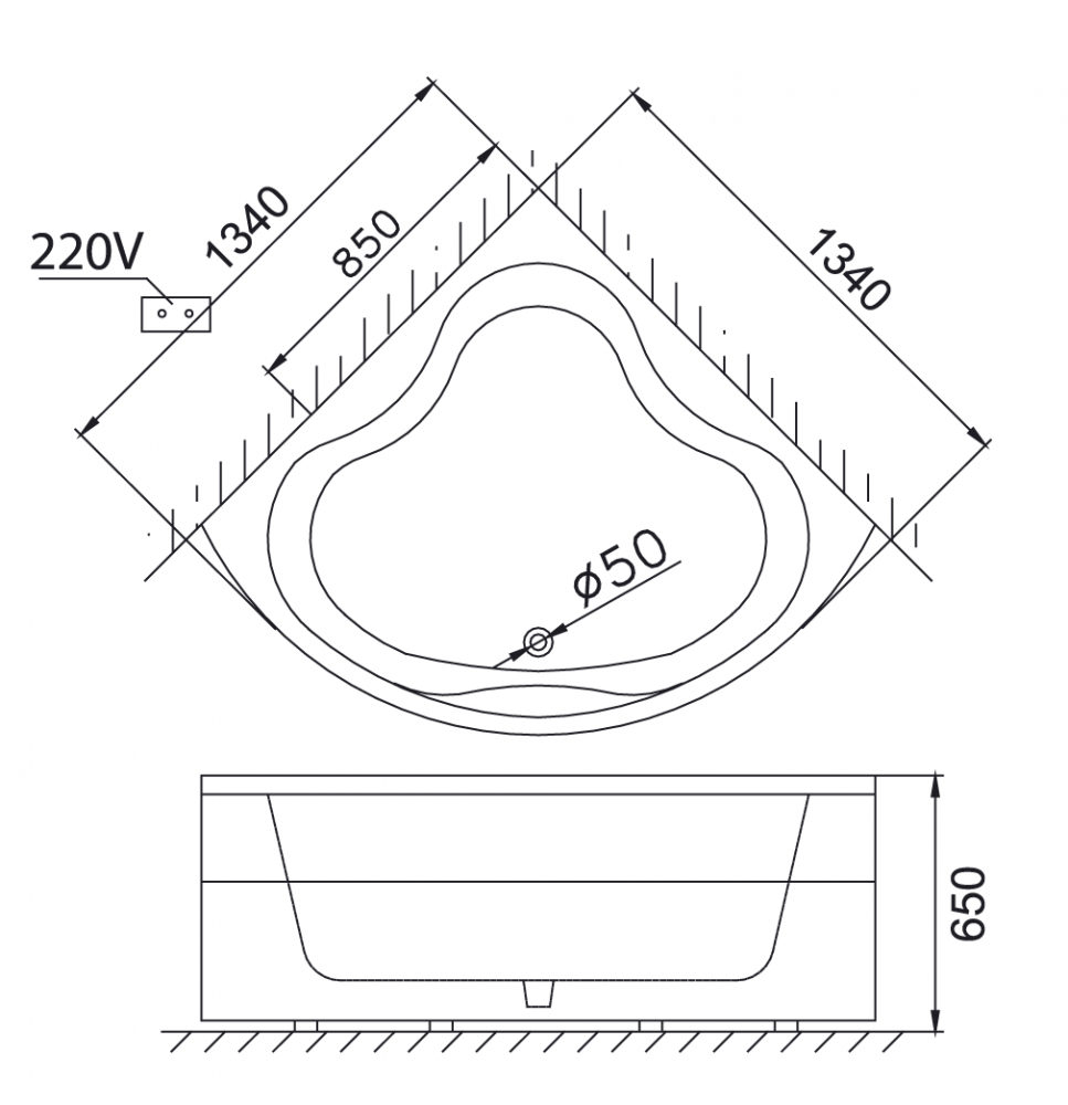 Bản vẽ kĩ thuật Bồn tắm CAESAR MT5133 Massage chân yếm góc 1.3M