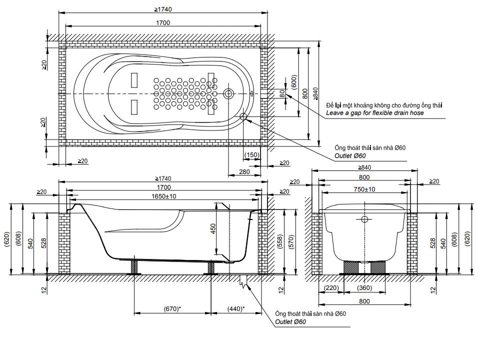 Bản vẽ kĩ thuật Bồn Tắm TOTO PAY1770DH DB501R-2B TVBF412 xây 1.7M